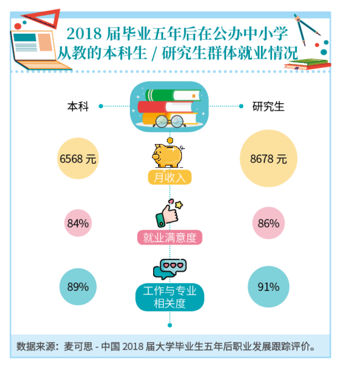 学历提升也让从教群体有了更高的就业质量。麦可思研究发现,2018届毕业五年后在公办中小学从教的毕业生中,拥有研究生学历群体月收入为8678元,比本科生群体(6568元)高出2110元。研究生学历群体的就业满意度(86%)和工作与专业相关度(91%)也要优于本科生从教群体。